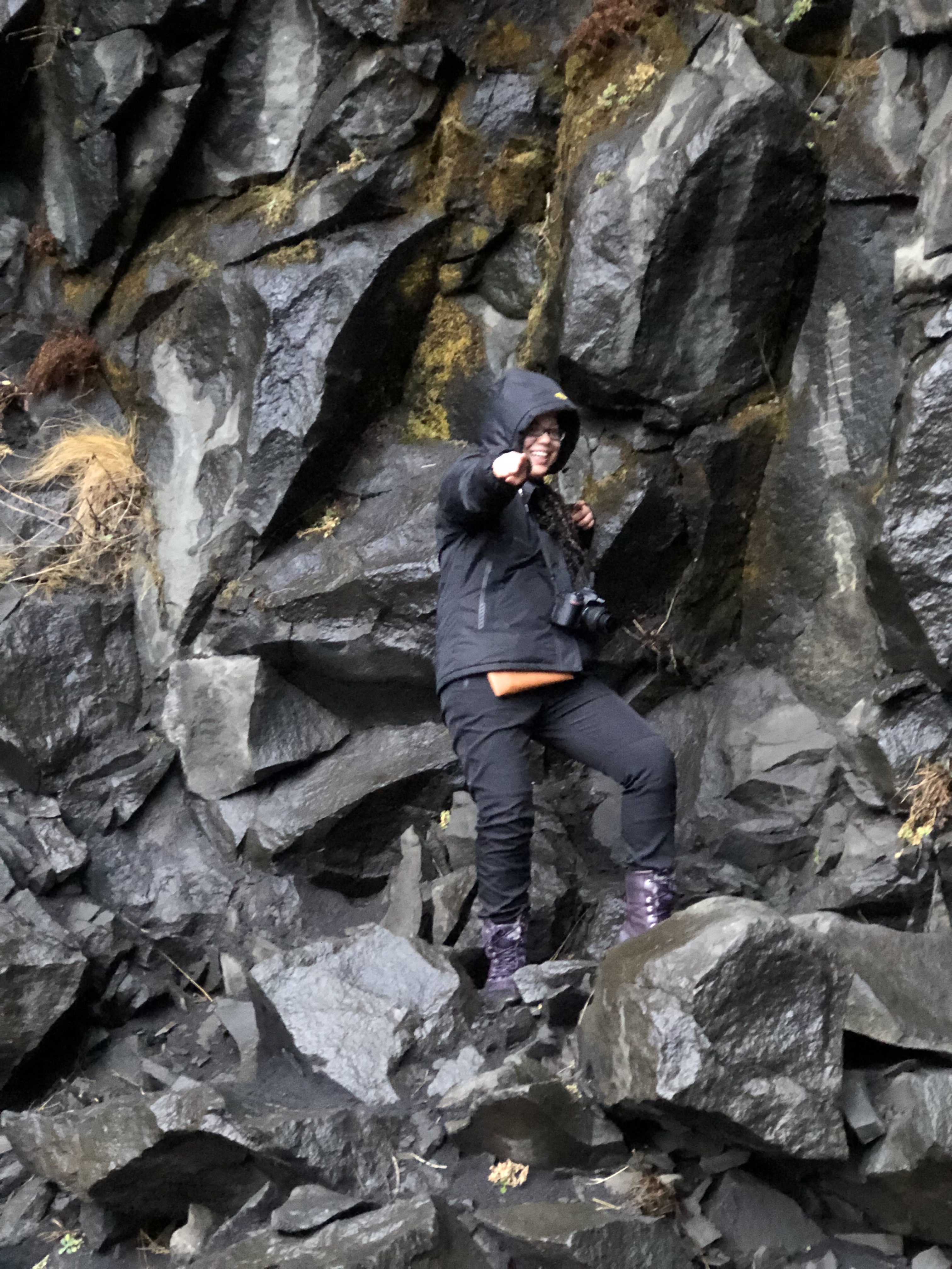 This was our last stop of the day before heading to a rest stop and ultimately our hotel in Höfn. This was my first time on a black sand beach. My cousin Kayla was prepared with a small mason jar to take some sand back home. The weather had been perfect all day. Until we hit the beach. Then it started lightly raining and the wind was furiously blowing. To the point where people were being knocked over by it. We were warned to stay way from water. Apparently the current is very strong. So we took several pictures, hung out by the unique cliffs for a bit, and headed back to our tour van. On the way back to the van I clumsily tripped and fell over a rock on the beach. Be careful!