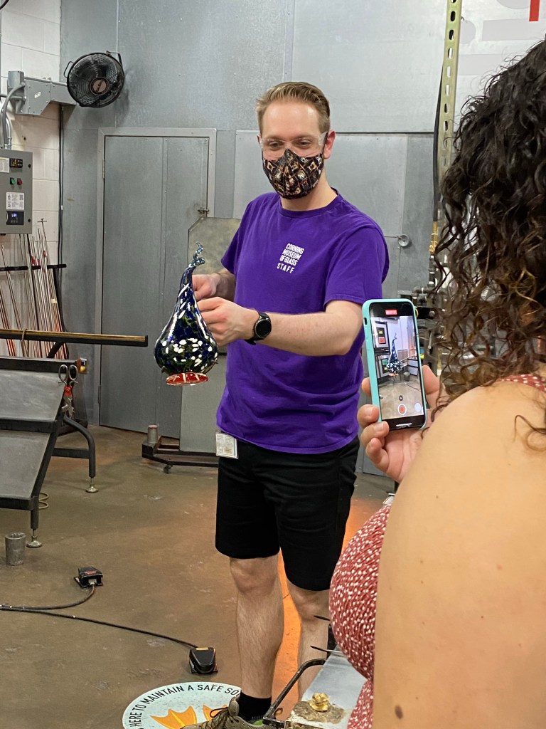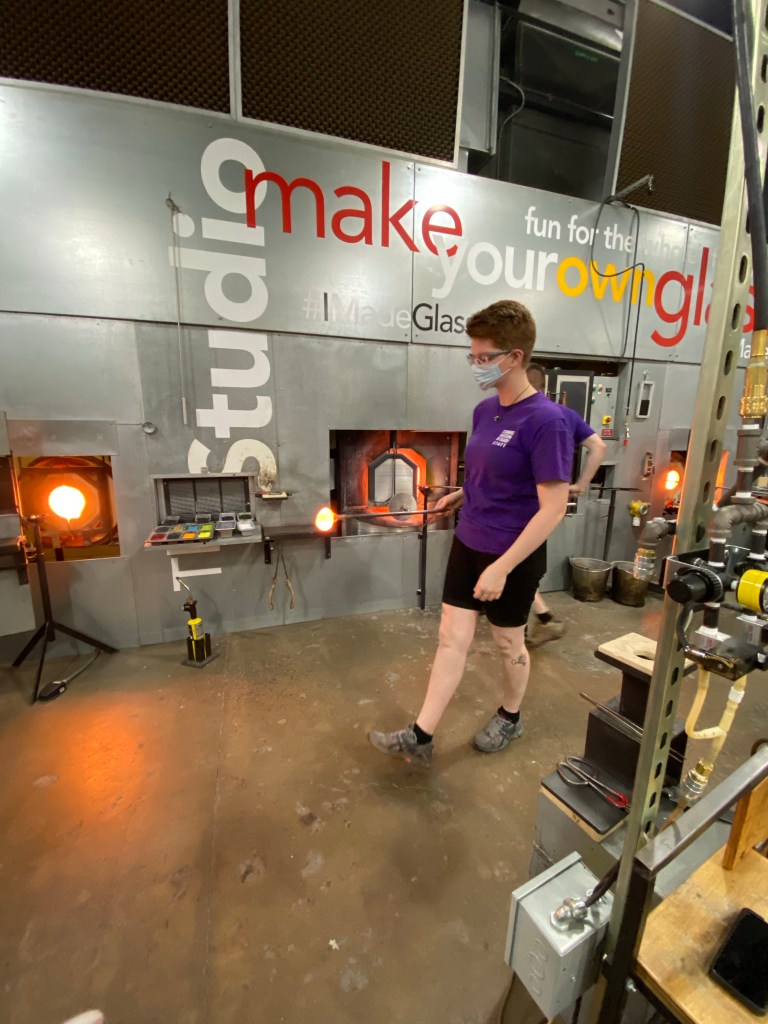 While this glass making experience wasn’t as hands on as the one in Quebec, I was still so excited. With covid protocols, we were only able to step on a pedal rigged to an air supply to “blow” air into the sculpture. But I very much enjoyed every minute of it. It was so cool to me to watch glass being made in person, again.