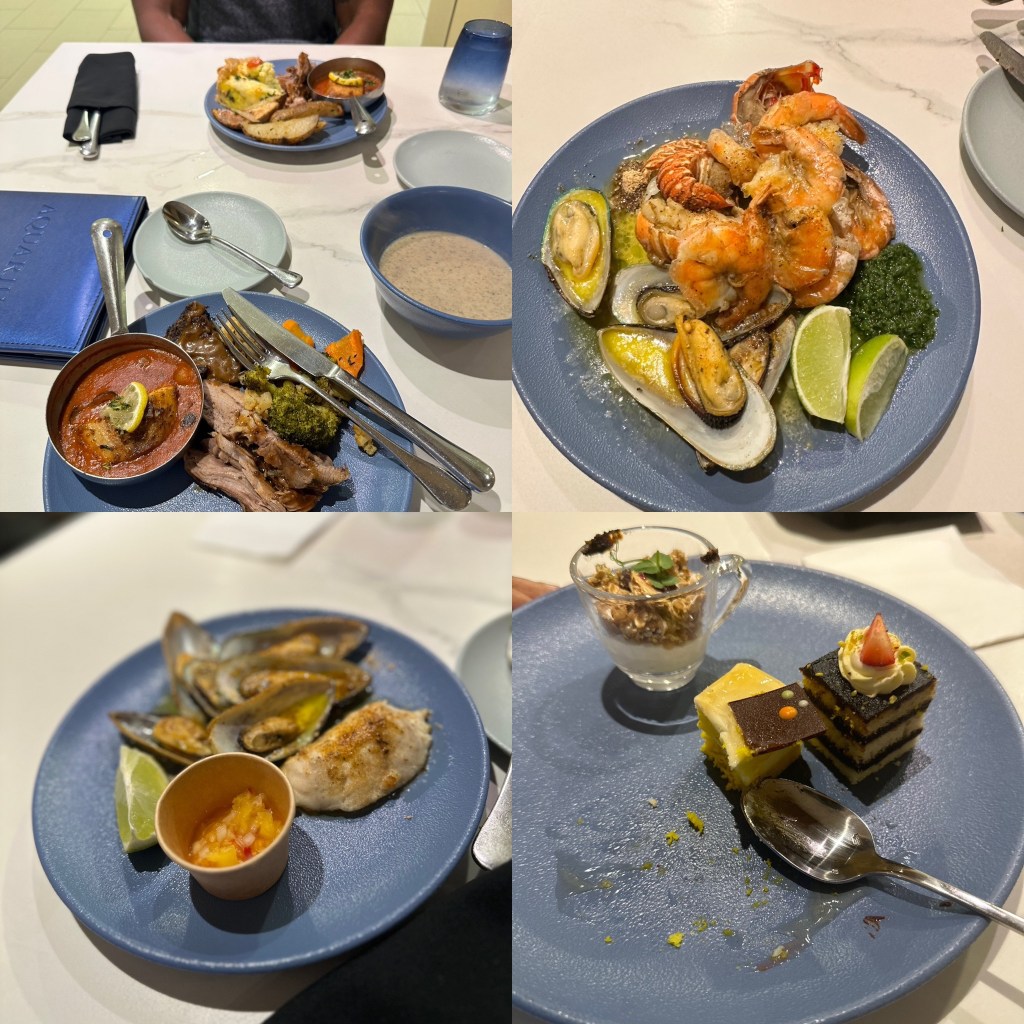 We were back in our room around 7 PM. We were trying to decide where to head for dinner. Personally, I’ve been really wanting to try this restaurant right across from the gym here called Aquarius. And that’s exactly where we went. We thoroughly enjoyed the dinner seafood buffet where they had a nice spread of hot food. Lamb and chicken and beef, tenderloin, veggies, quiche, sushi salads, soup. But the highlight was the made to order seafood. We helped ourselves to a couple rounds of lobster, muscles, shrimp, and fish.